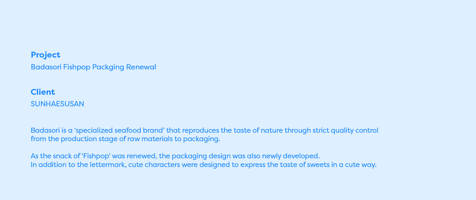 선해수산의 자사 브랜드 '바다소리'의 피쉬팝 스낵 패키지 디자인 리뉴얼과 캐릭터 일러스트레이션 개발입니다.